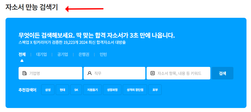 잡코리아에서는 직무 분야, 학력, 근무 형태 등 다양한 조건을 설정해 맞춤형 자기소개서 샘플을 열람할 수 있습니다. 실제 합격 사례를 기반으로 작성된 자료가 많아 참고하기 좋습니다.