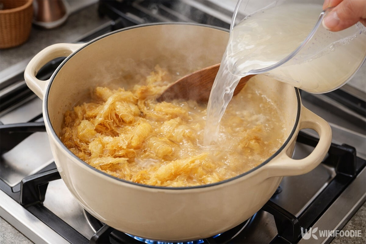 황태를 볶은 뒤에는 바로 물을 붓고 무를 넣어 함께 끓여야 합니다. 무는 황태국의 시원한 맛을 책임지는 재료이기 때문에 넣는 타이밍이 중요합니다.