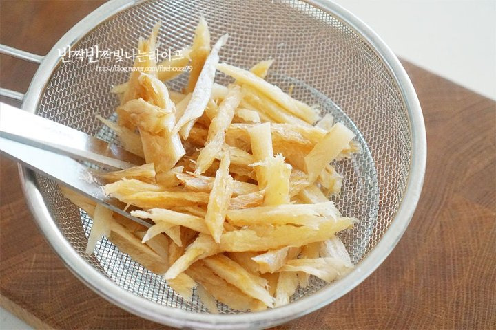먼저 황태채를 찬물에 5분 정도 담가줍니다. 너무 오래 담가두면 황태 특유의 맛이 빠질 수 있기 때문에 짧게 불리는 것이 좋습니다. 이후 손으로 가볍게 물기를 짜주고, 너무 긴 부분은 먹기 좋은 길이로 잘라주면 됩니다.