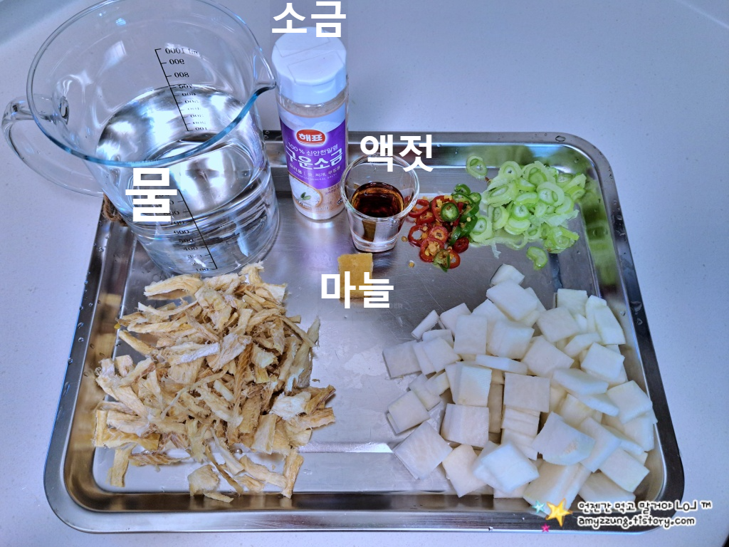 기본적으로 황태채 1줌, 무 150g 정도, 두부 반 모, 대파 반 대, 계란 1개, 물 1.5리터 정도를 준비하면 2~3인분 기준으로 알맞습니다. 여기에 참기름, 국간장, 다진 마늘, 소금, 후추 정도가 들어갑니다.